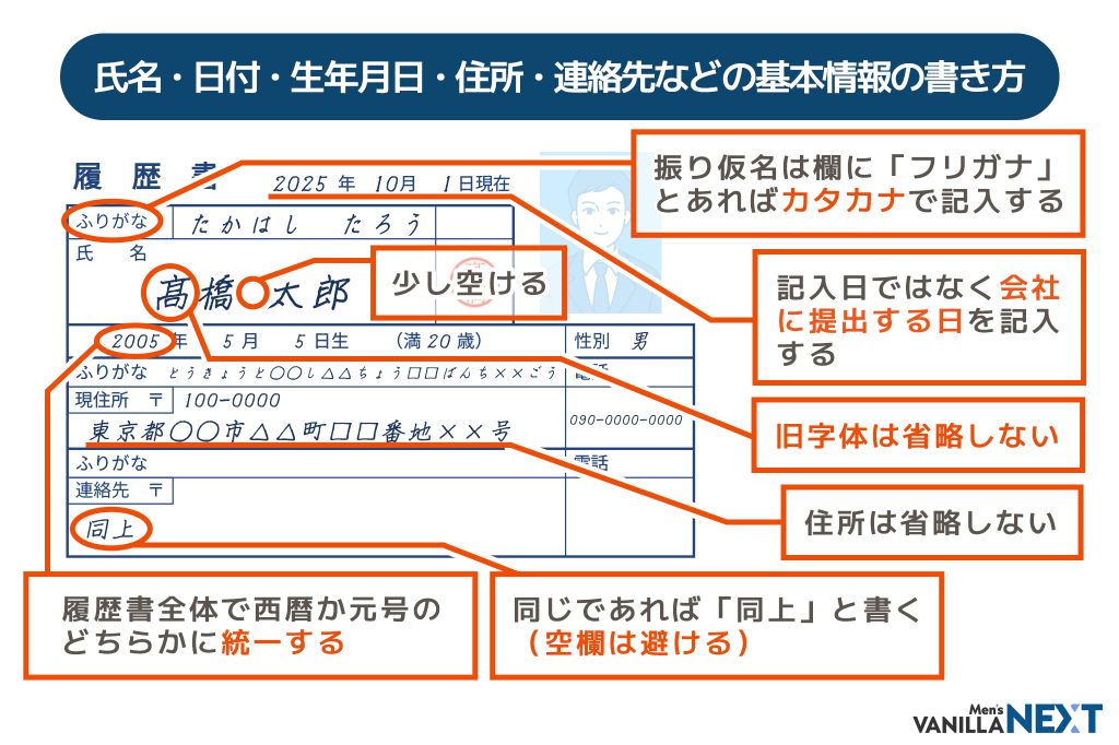 履歴書の基本情報の部分にあたる氏名や生年月日、住所など、合計5項目の書き方で押さえておくべきポイントは以下のとおりです。