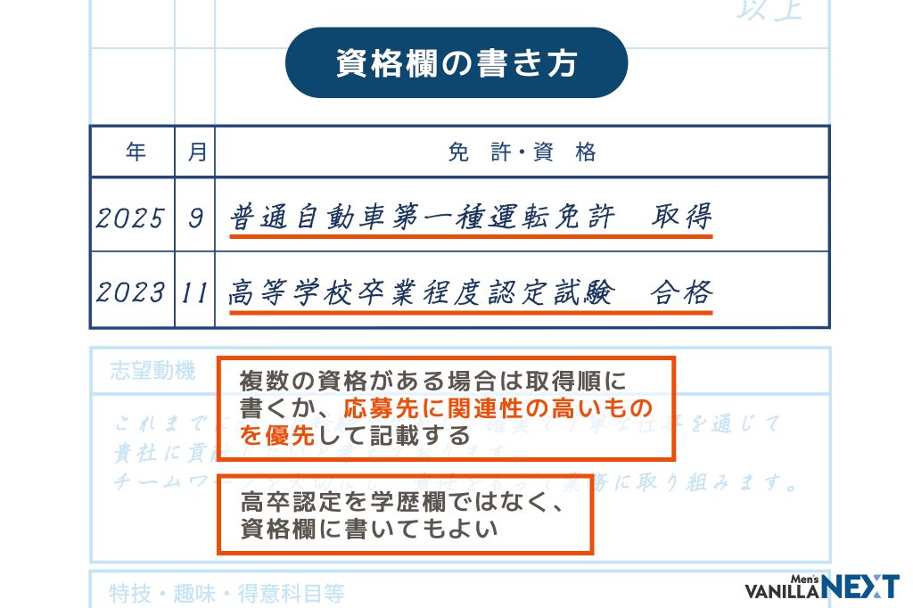 また、「高卒認定(高等学校卒業程度認定試験)」は学歴欄ではなく、資格欄に書いても問題ありません。