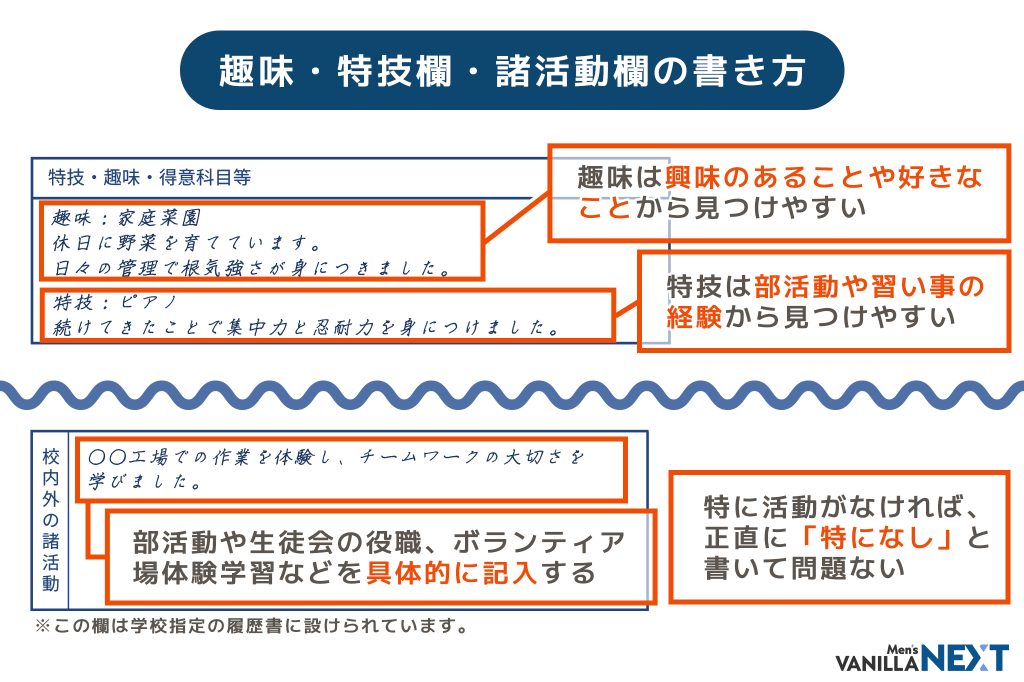 また、履歴書によっては趣味・特技欄がなく、代わりに「学校や地域での活動をアピールできる欄」が設けられている履歴書もあります。