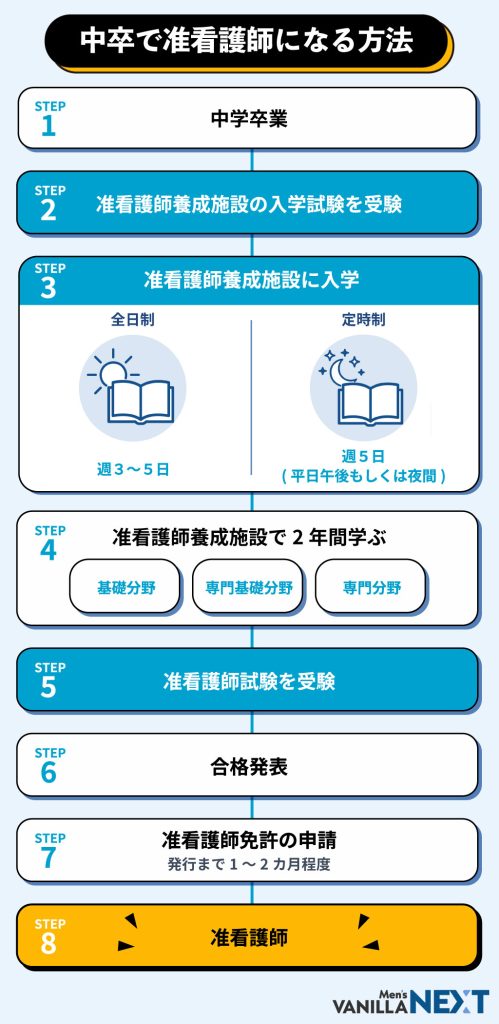 ここからは、中卒で准看護師になる方法と手順について解説していきます。